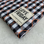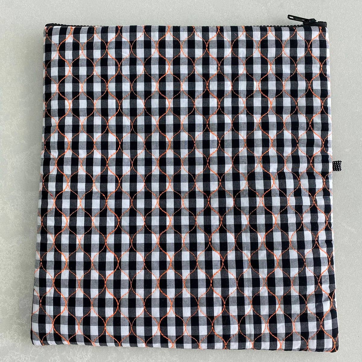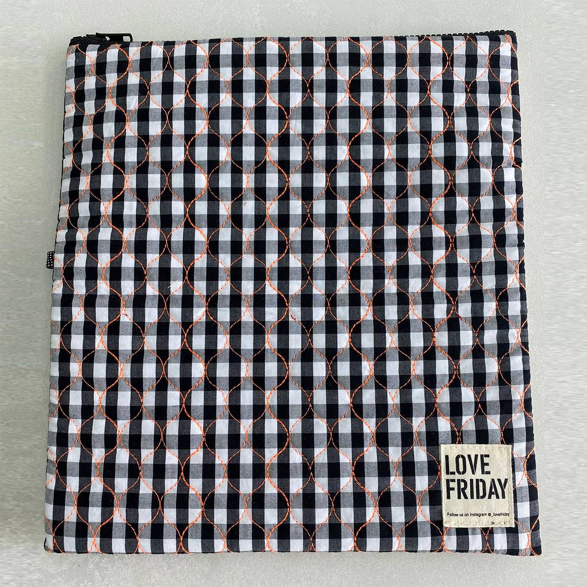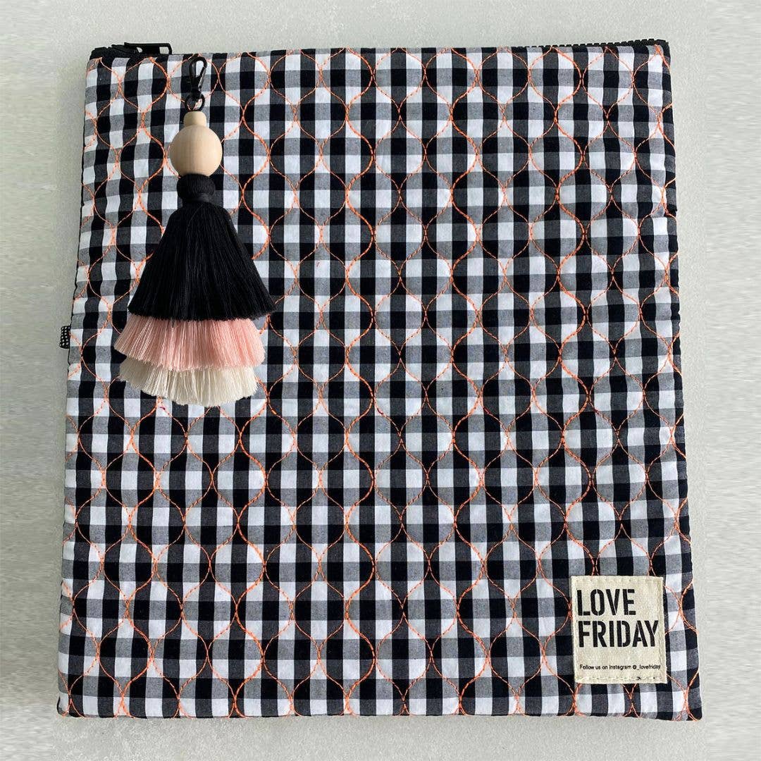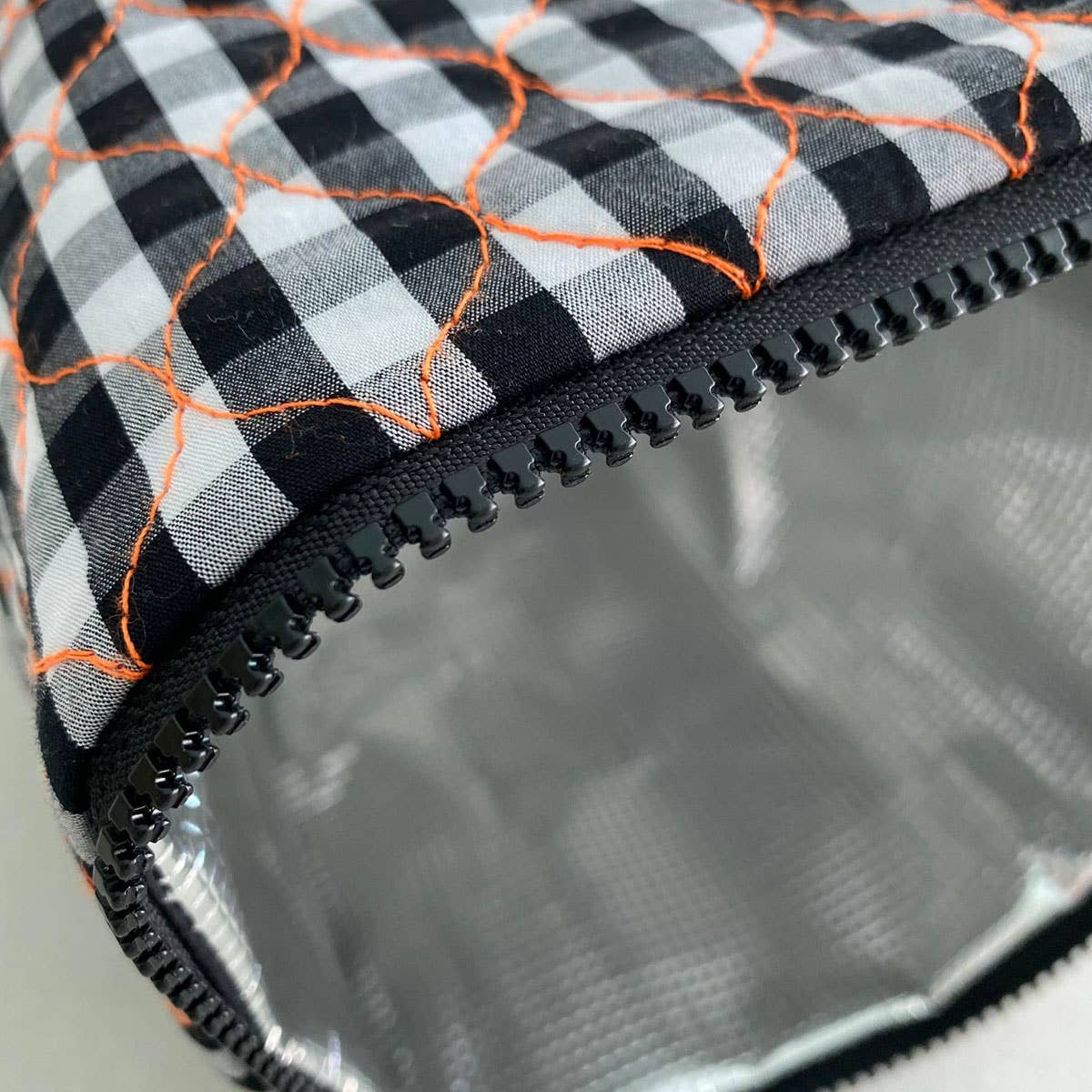 Fabric: Black and white check quilted gingham with bright orange stitching Lining: Thermo Lining and Insulated Zipper: YKK Black Tag: To attach accessory Size: 30cms wide x 32cms high (one size) Accessory: Tassel Black C.O.A; China, Java, Australia