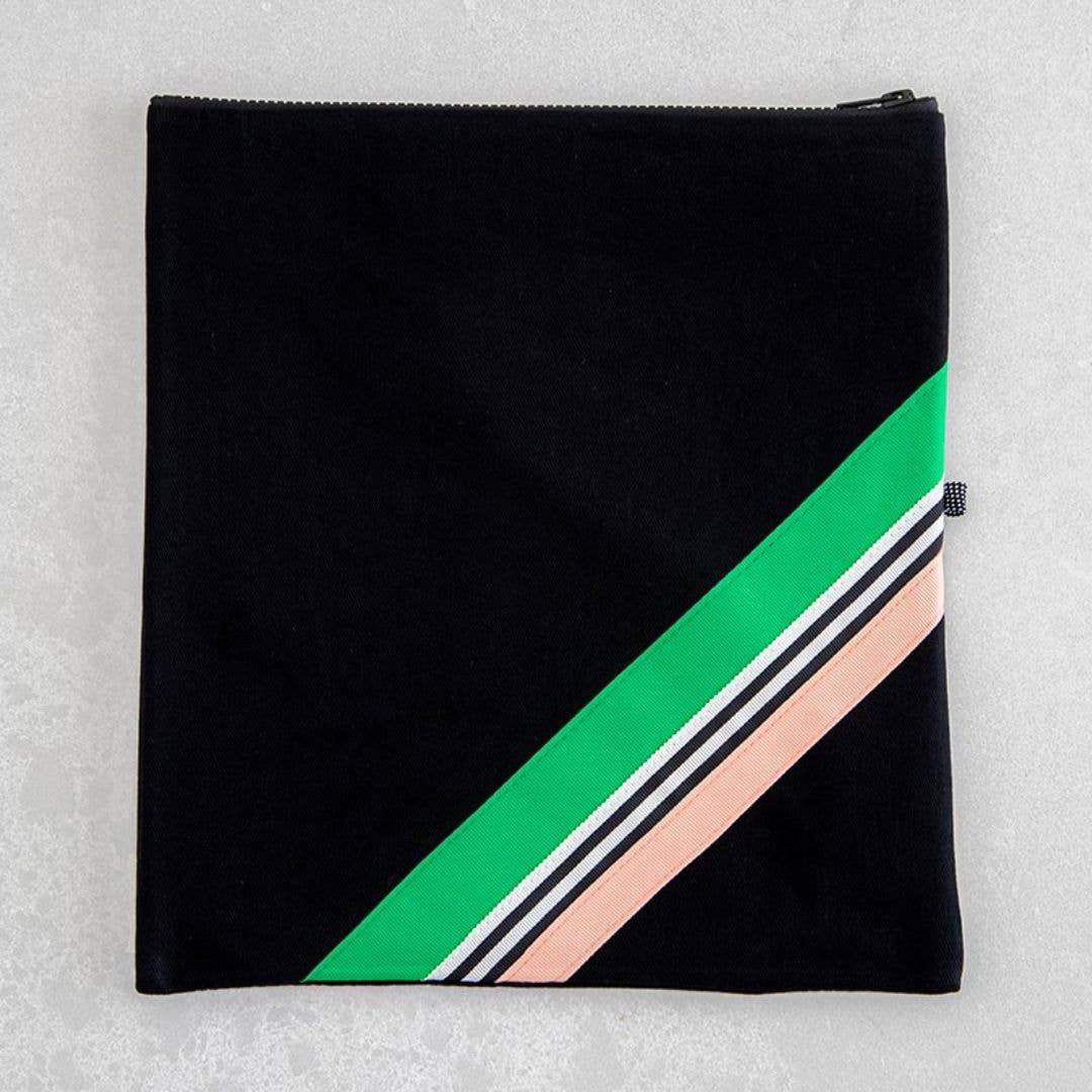 Fabric: Grosgrain ribbons stitched on black moleskin fabric Lining: Thermo Lining and Insulated Zipper: YKK Black Tag: To attach accessory Size: 30cms wide x 32cms high (one size) Accessory: Pom Pom Moss C.O.A; China, Java, Australia