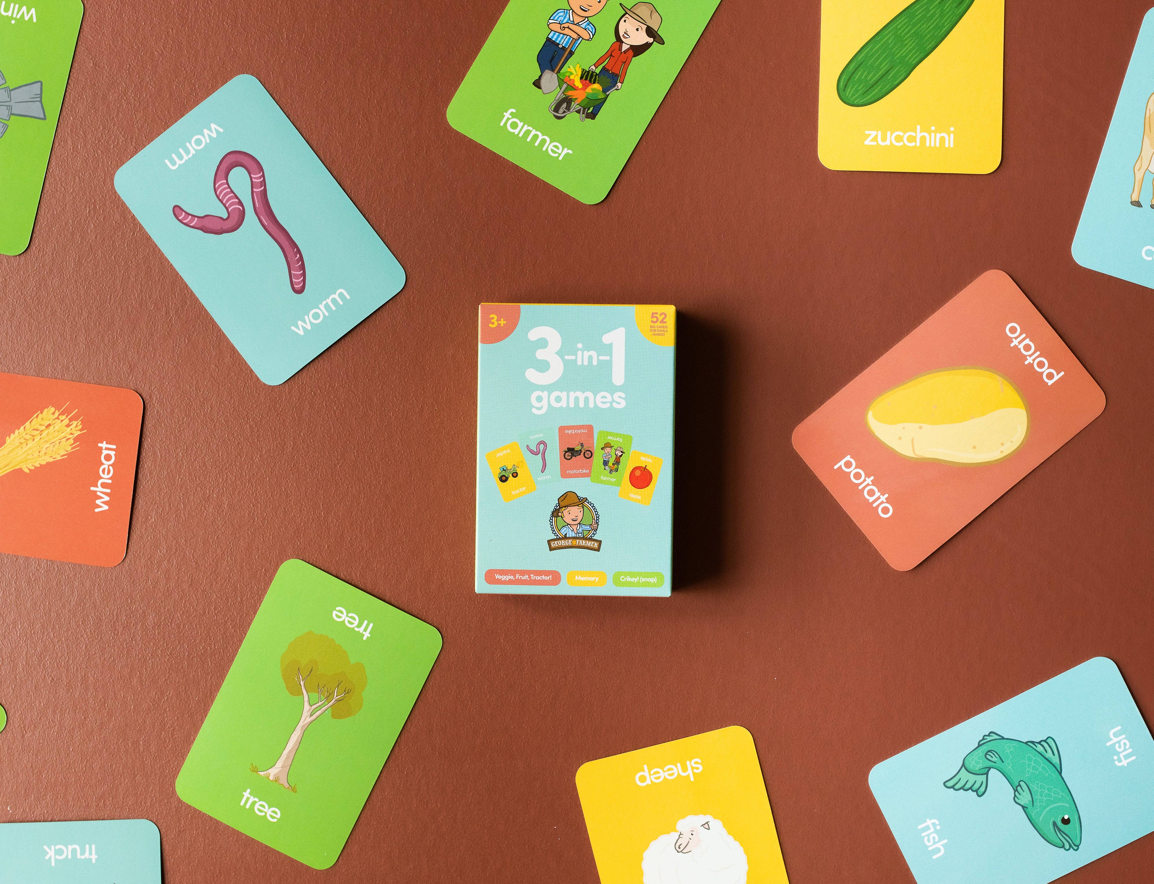 Enjoy three ripper card games featuring illustrations from the farm. Play snap with a twist in Veggie, Fruit, Tractor! Test your pairing skills in Memory and be the fastest hand in Crikey! 52 laminated cards on 300gsm gloss stock. Ages: 2+