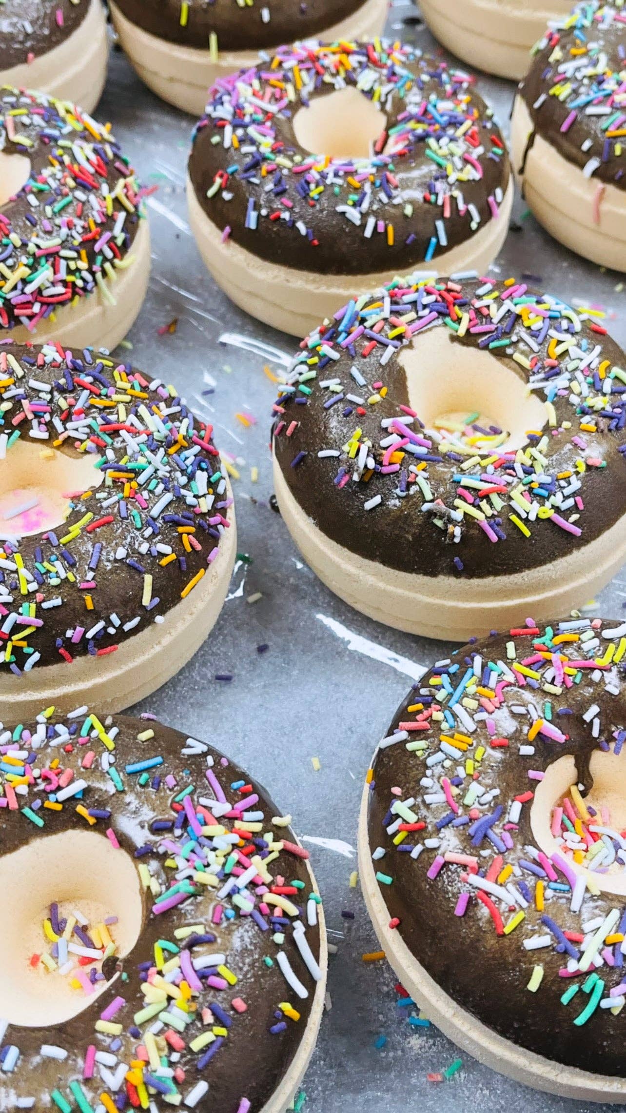Our bath bombs are SLS/SLSA free ! These bath bombs are shaped in a donut form. Shrink wrapped for protection Ingredients: sodium bicarbonate, citric acid, grapeseed oil, witch hazel, sodium coco sulphate (derived from coconut oil), polysorbate 80, glycerine, kaolin clay, cream of tartar, mica, fragrance, candy Net Weight: 300g BARCODE: This item is barcoded.