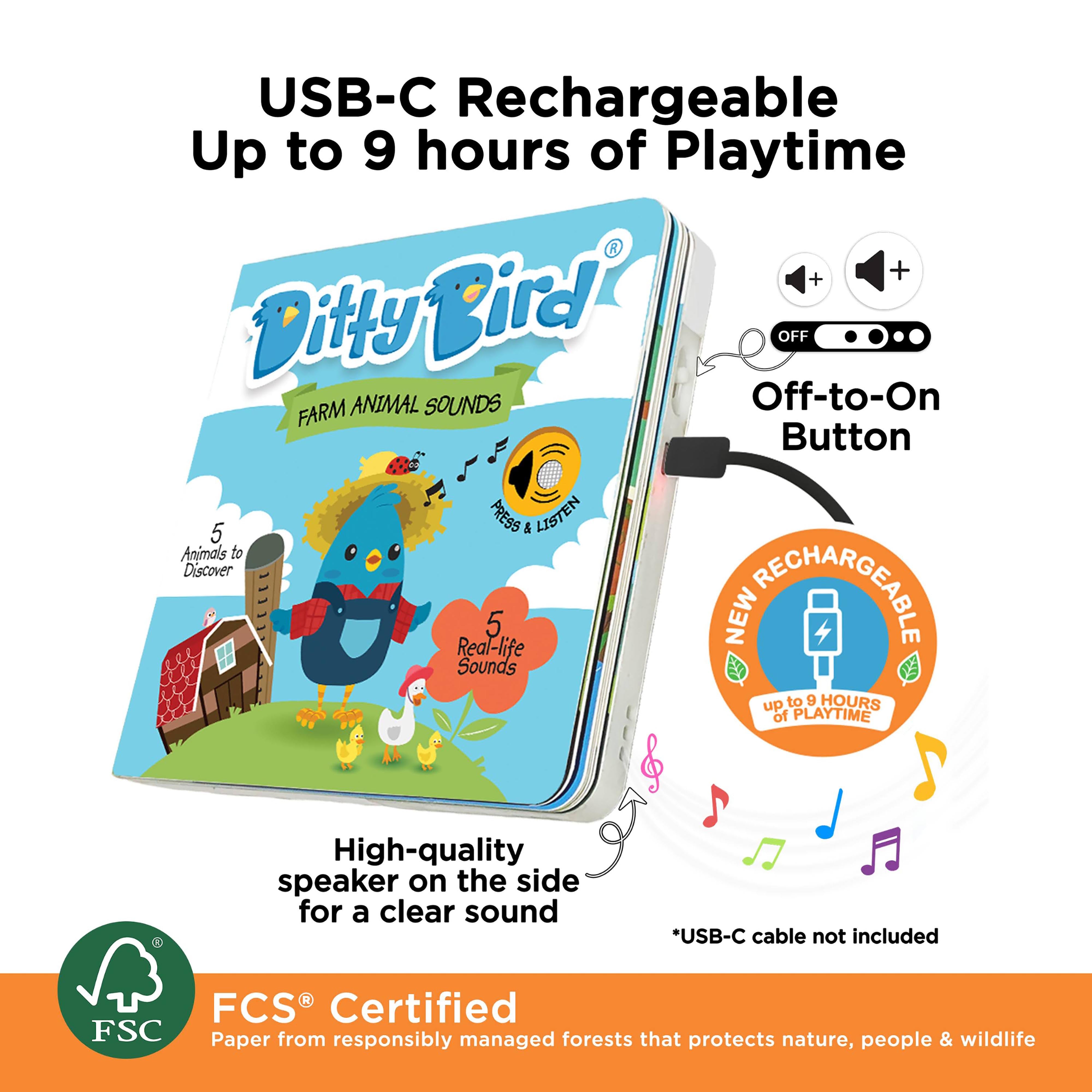 Designed for curious toddlers aged 1+, this award-winning sound book helps children learn animal names, sounds, and early vocabulary through interactive play. With its USB-C rechargeable design and two volume settings, the Ditty Bird Farm Animal Sounds Book is as educational as it is entertaining.