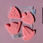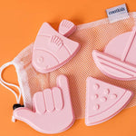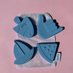 Our Shelley Beach Moulds are silicone shapes, unique to Coast Kids.  Designed for easy travelling and packing, fitting perfectly inside the soft Palm Beach Bucket.  Available in a set of four with a white netted carry bag, made from recycled plastic bottles.  Suitable for all ages. Parental supervision recommended. Designed in Woonona. Made in China. Measurements - about 11cm long per shape.