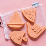 Our Shelley Beach Moulds are silicone shapes, unique to Coast Kids.  Designed for easy travelling and packing, fitting perfectly inside the soft Palm Beach Bucket.  Available in a set of four with a white netted carry bag, made from recycled plastic bottles.  Suitable for all ages. Parental supervision recommended. Designed in Woonona. Made in China. Measurements - about 11cm long per shape.