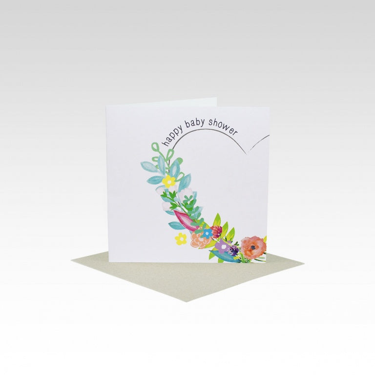Mini Baby Shower card with muticoloured floral heart design on crisp white cardstock. Text on front reads “Happy Baby Shower”.