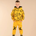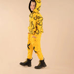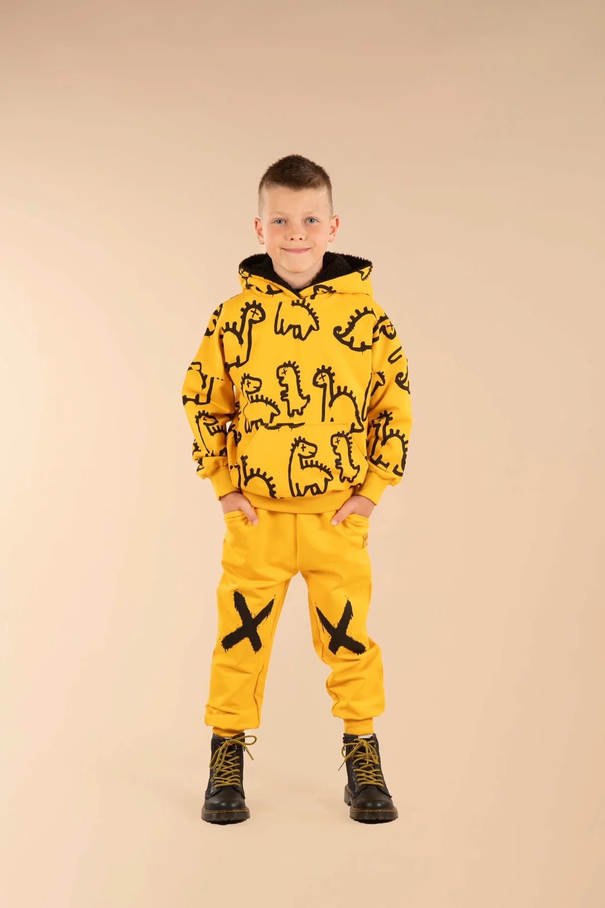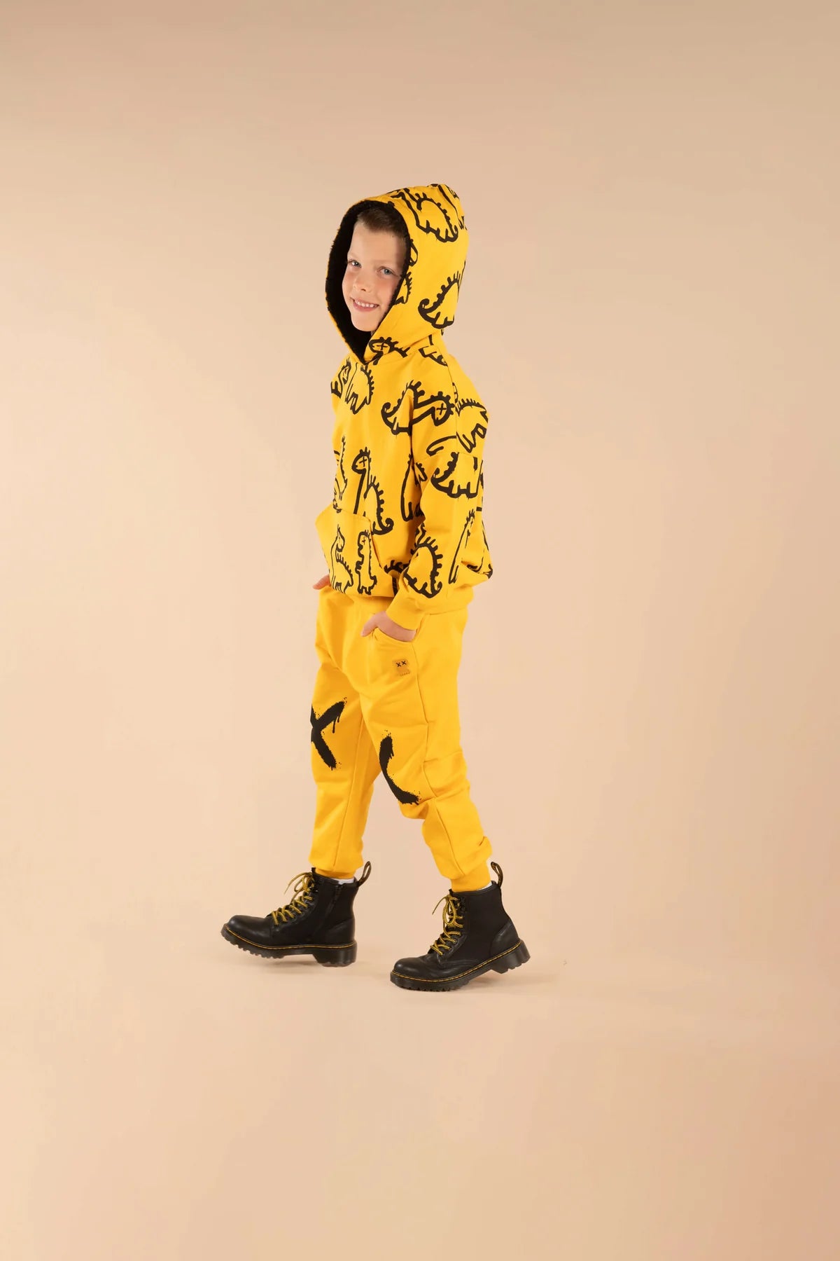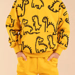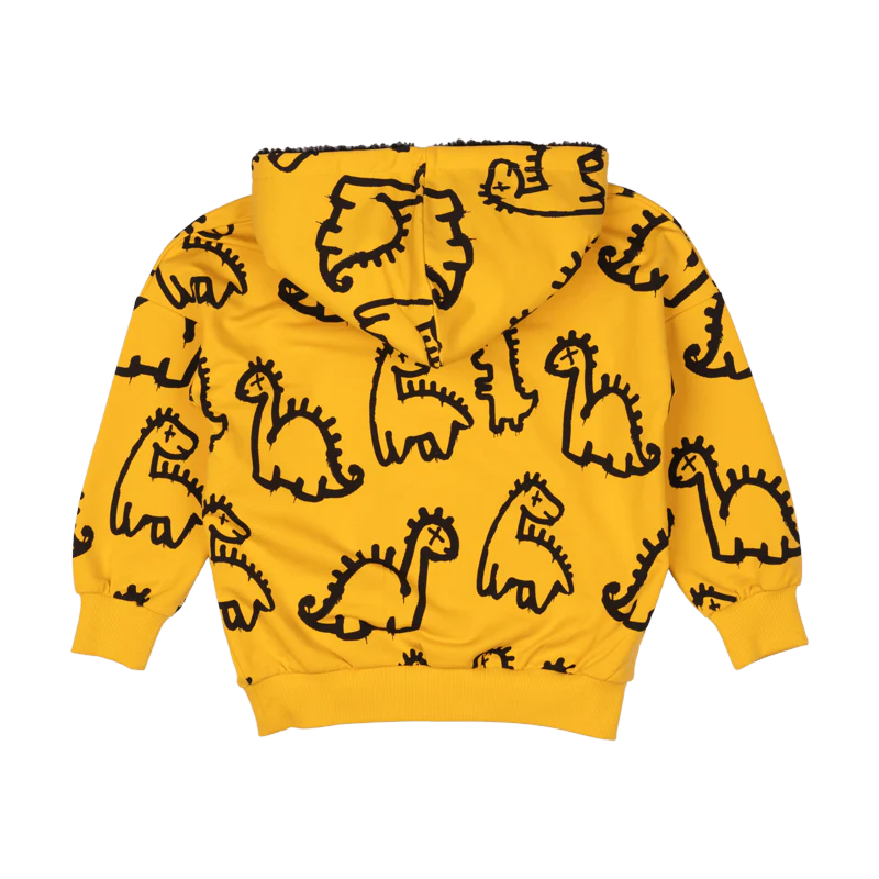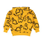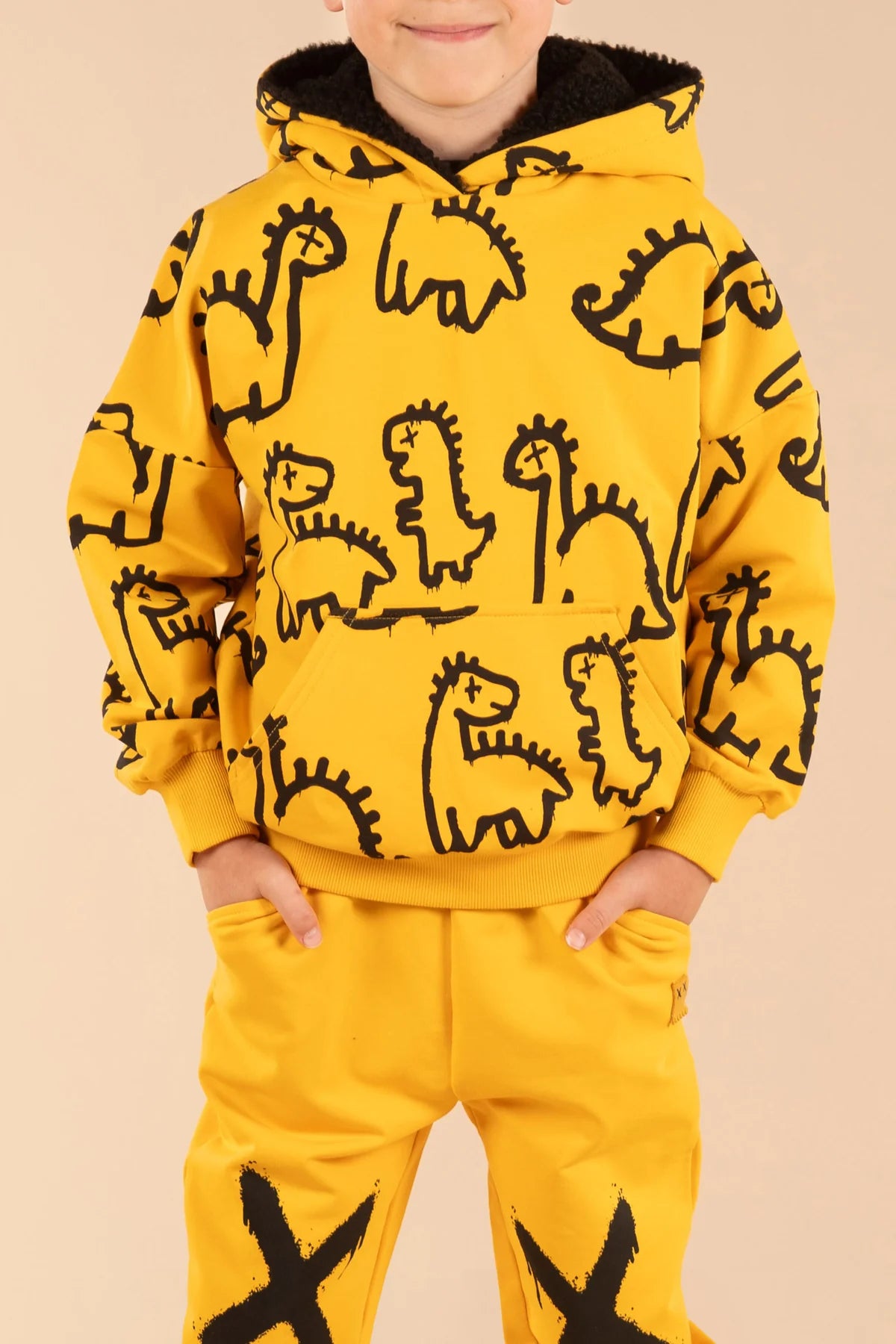 Graffiti Hooded Sweatshirt! Made from a cotton and French Terry blend, this loose fit sweatshirt features an all-over dinosaur print on a yellow base. Features elasticated cuffs and hemline, with black sherpa lining in the front pocket and hoodie.