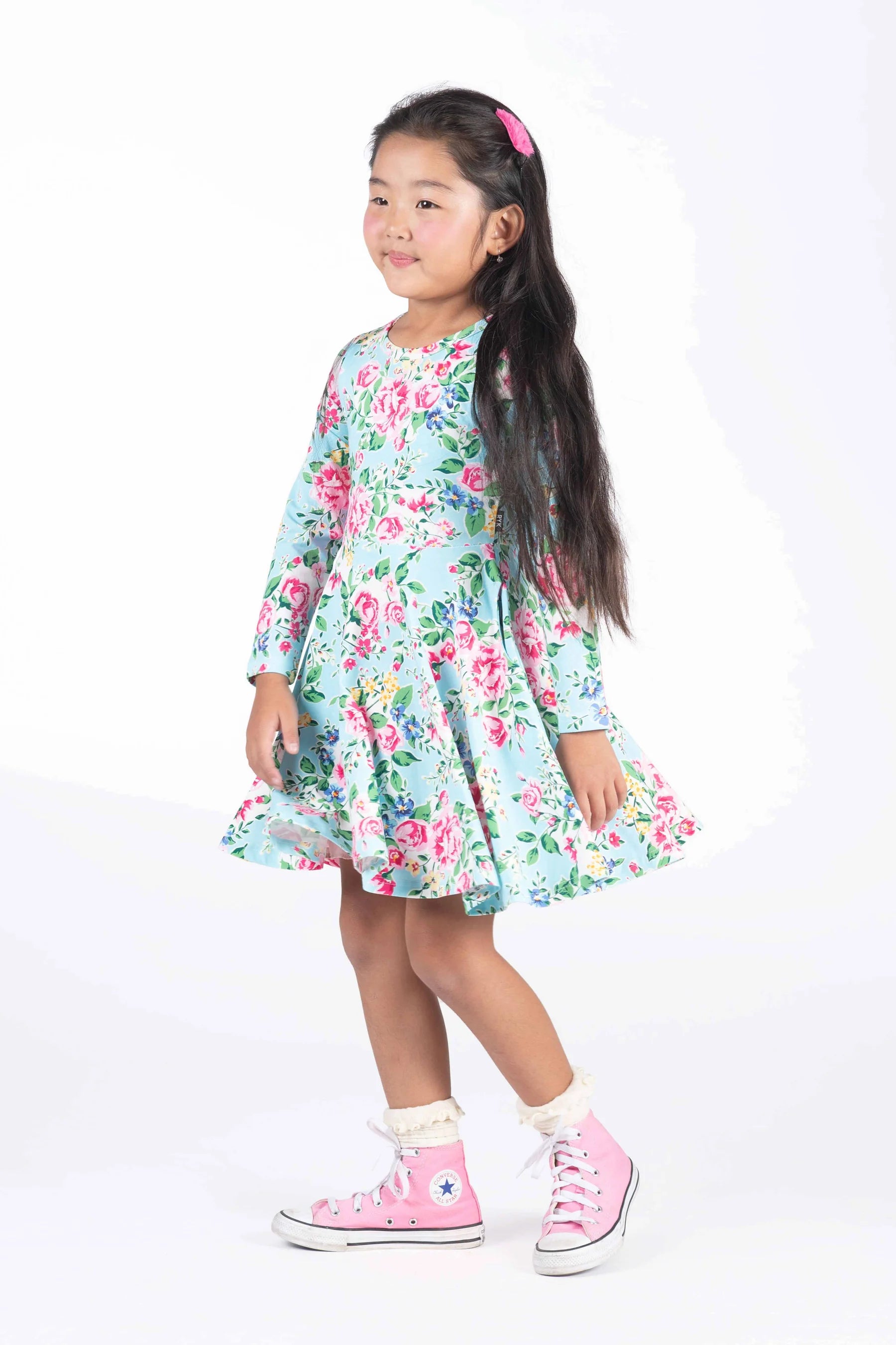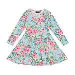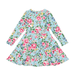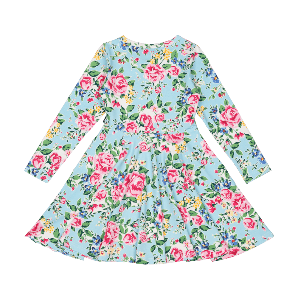 Introducing our Blue Garden Waisted Dress! Made from a blend of 95% cotton and 5% elastane jersey, this dress features a floral pattern on a blue base with long sleeves, a circle skirt and front side pockets.